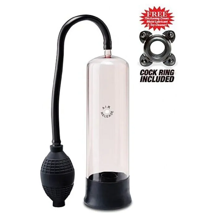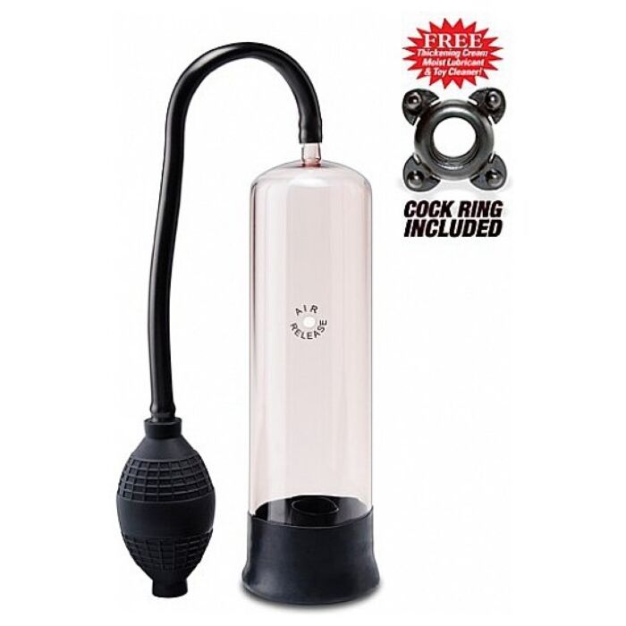 La pompa de erección novato del A Pump Worx tiene un boquilla elástica que crea un sello perfecto, un cilindro trasparente que te permite ver lo que pasa, es 100% libre de Phalatos y un botón de liberación rápida de presión.