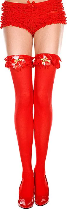 Calza opaca firmata Music Legs pensata per occasioni natalizie: coprente, con fiocco decorativo e una piccola campanellina sulla giarrettiera. Perfetta se cerchi un accessorio che aggiunga un tocco giocoso e festivo al tuo outfit intimo. Non è una calza tecnica da compressione; è più indicata per eventi, costume o serate speciali.