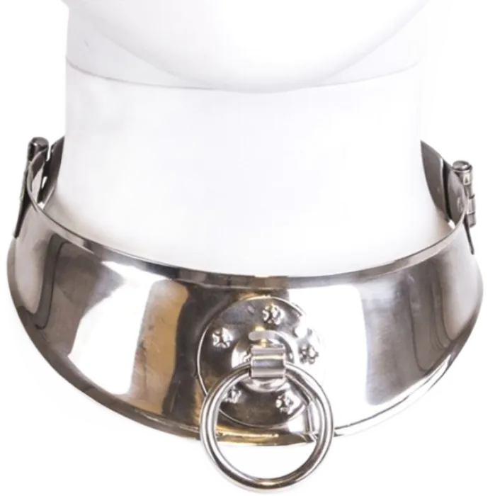 Collare di sottomissione in acciaio inox, concepito per uomini, con un design sexy e versatile. Include un anello per catene e un lucchetto.