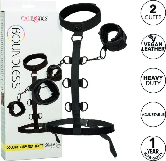 Espandi i tuoi orizzonti nel bondage con il collare Boundless di CALEXOTICS. Realizzato in pelle vegana, offre un comfort eccezionale e la possibilità di restrizioni versatili.