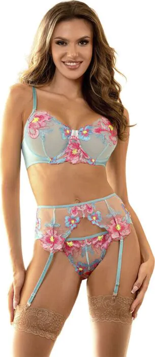 Scopri un completo di lingerie che esalta la tua femminilità con eleganza. Il suo design in rete traslucida e i dettagli floreali sono perfetti per mettere in risalto le tue curve.