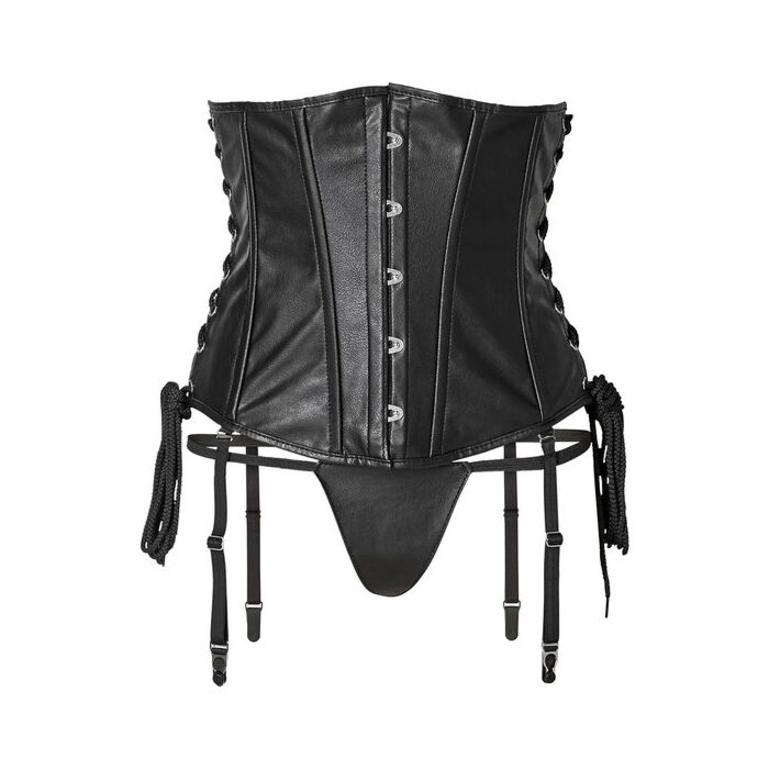 Sexy corsé corto de color negro anudado con cordones y tanga a juego de la prestigiosa colección Avanza.