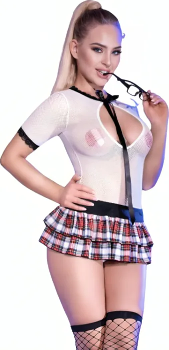 Attira l'attenzione con il costume da scolaretto CR 4364 di CHILIROSE, un insieme seducente che unisce sensualità e un tocco di innocenza. Realizzato in morbida malla bianca, questo completo esalta la silhouette femminile con il suo scollo profondo e i dettagli in pizzo che lo rendono un'opzione davvero accattivante. La gonna corta a pieghe con fantasia scozzese aggiunge un elemento di divertimento e provocazione, ideale per serate speciali.