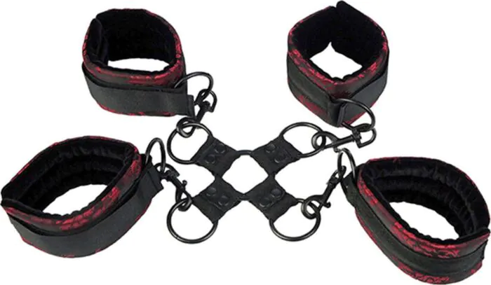 Le manette Scandal Hog Tie sono un set di fissaggio pensato per il gioco bondage leggero e modulare. Hanno quattro polsini morbidi e regolabili con esterno in broccato rosso e nero che dà un aspetto curato e seducente. Il connettore centrale con anella in O resistente e girevole permette di cambiare facilmente orientamento e posizione durante il gioco, mentre le chiusure in velcro rendono l'aggancio e lo sgancio rapidi e pratici.