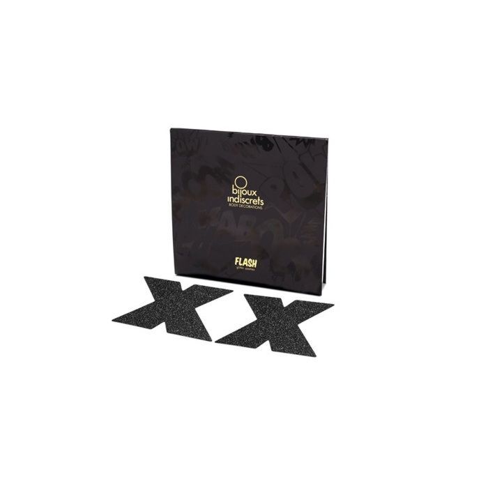 Sveglia la supereroina che hai dentro di te con le coppe capezzolo Bijoux flash incrociate nere! Diventa la protagonista delle tue fantasie e fai cedere al potere dei tuoi incantesimi più seducenti. La collezione FLASH ti offre la possibilità di brillare con luce propria grazie a queste decorazioni corporee autoadesive di un nero intenso e abbagliante.