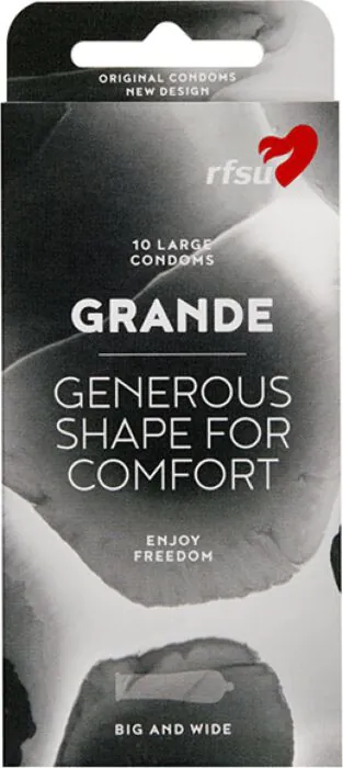 El RFSU Grande es transparente, lubricado, hecho de látex natural y con depósito. El RFSU Grande reemplaza al RFSU Okeido que ya no se encuentra en la colección de RFSU.0.070 mmlargo 190 mmcontorno 106 mmancho en la base 53 mmancho en la cabeza 54 mm