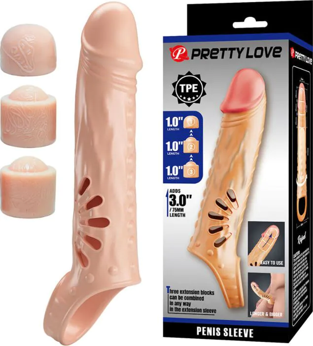 Sfrutta la guaina per pene di Pretty Love con estensori per aumentare lunghezza e volume. Perfetta per chi cerca una stimolazione personalizzata.