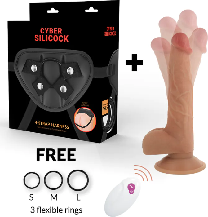 Kit completo composto da imbracatura regolabile in vinile e dildo in 'CYBER SILICONE SKIN' (silicone medicale liquido). Perfetto per chi cerca un effetto realistico con controllo a distanza: motori multi‑frequenza, sistema Up & Down e base a ventosa. Include 3 anelli in silicone per adattare diversi diametri e cavo USB per la ricarica.