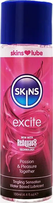 SKINS Excite è un lubrificante a base acqua pensato per intensificare la stimolazione. Contiene L‑arginina, che favorisce il flusso sanguigno nella zona applicata, e estratti vegetali come il trifoglio rosso e il Ginkgo biloba che aggiungono un effetto afrodisiaco; il mentolo contribuisce alla sensazione di lieve formicolio. È trasparente, non macchia e può essere riattivato con poche gocce d'acqua grazie alla tecnologia ReAquav8 — pratico durante rapporti lunghi o sessioni con sex toy.