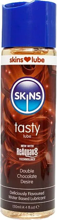 Questo è un lubrificante a base d'acqua al gusto intenso di cioccolato, pensato per aggiungere una nota golosa ai vostri giochi. La caratteristica che lo distingue veramente è la tecnologia Skins Reaquav8: se durante la sessione il prodotto tende ad asciugarsi, basta un leggero lametata o uno spruzzo d'acqua per riportare in vita sapore e scivolosità. La formula è vegana, setosa al tatto, di lunga durata e studiata per non macchiare più del necessario.