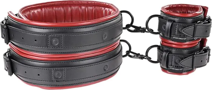Set di manette che collega coscia e polso per ridurre la mobilità in giochi BDSM: due elementi separati, imbottiti e regolabili con fibbie e clip per creare molte combinazioni. Pensato per chi cerca comfort durante l'immobilizzazione senza rinunciare a un sistema solido e facile da adattare alla misura.
