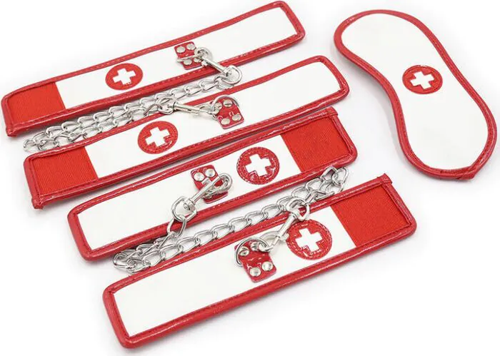 Scopri il set bondage infermiera di OHMAMA FETISH, completo di polsini e antifaz. Un gioco intimo che stimola la fantasia e il piacere.