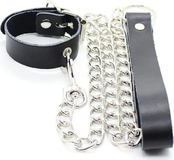 Sensazioni intense con il collar per pene di OHMAMA FETISH. Realizzato in pelle di alta qualità e dotato di catena metallica, è consigliato per chi ama il bondage e cerca un'esperienza avvolgente.
