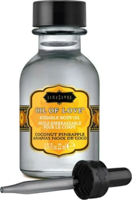 Olio kissable commestibile KAMASUTRA al gusto cocco e ananas pensato per i preliminari: sapore intenso, leggero effetto di calore sulla pelle e pratico applicatore. Base acqua, non unge e non macchia; perfetto se cerchi un tocco giocoso e gustoso per baciare e stimolare le zone erogene. Non è un lubrificante né un olio da massaggio.