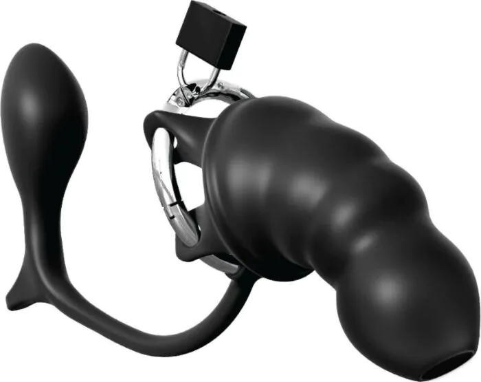 È un anello di castità che integra un plug anale progettato per stimolare direttamente la prostata insieme a una gabbia in acciaio inox coperta da una morbida fodera in silicone. La combinazione plug+gabbia con foro sull'area dell'uretra, più il candado con chiavi, lo rende un oggetto pensato per giochi fetish e per chi vuole sia controllo che stimolazione interna.