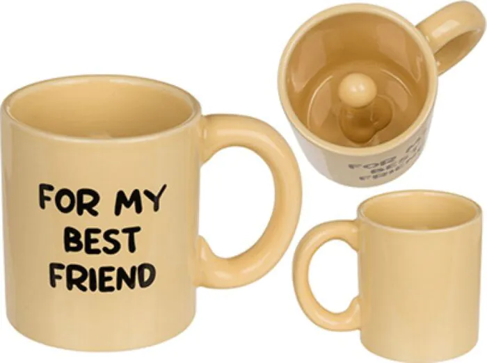 Questa tazza è un oggetto regalo pensato per far sorridere: dall'esterno sembra una comune tazza in ceramica, ma dentro contiene un elemento a forma di pene e la scritta decorativa "For my best friend". È un pezzo che punta sull'effetto sorpresa e sull'umorismo, ideale quando vuoi regalare qualcosa di irriverente ma curato nello stile.