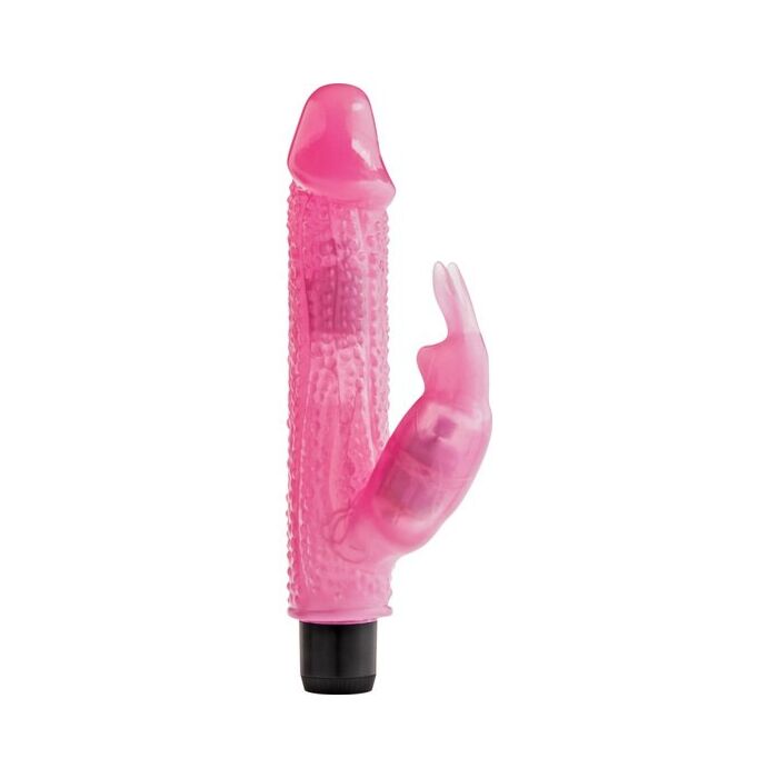 Es un vibrador texturizado con relieve en color rosa con un conejito estimulador.
