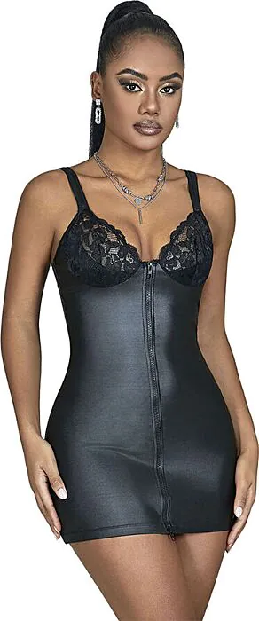 Con la sua zip frontale, puoi regolare l'apertura per un tocco di mistero e seduzione. Le trasparenze del pizzo aggiungono un tocco di sensualità, mentre il materiale effetto vinile conferisce un'aria di ribellione e raffinatezza. Questo vestito è consigliato per chi desidera distinguersi in occasioni speciali o durante giochi di seduzione. Se cerchi qualcosa di più sobrio, questo non è il tuo capo.