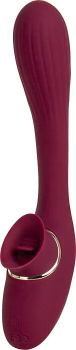 Ti spiego come te lo direi in negozio: questo vibratore è un sex toy a doppia stimolazione progettato per lavorare sul punto G dall'interno e sul clitoride dall'esterno con due motori indipendenti. La parte insertabile ha una punta arrotondata e un flexo che facilita la scelta dell'angolazione; la "lingua" esterna è molto flessibile e alterna carezze e leggeri colpetti, pensando a stimolazioni diverse. Il risultato è un giocattolo pensato per adattarsi a corpi diversi senza richiedere forzature.